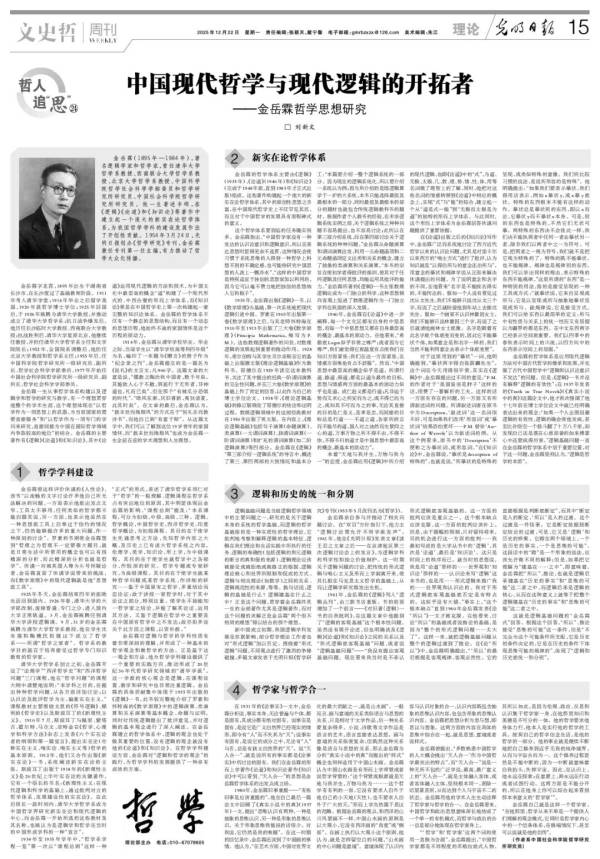金岳霖(1895年—1984年),著名邏輯學(xué)家和哲學(xué)家,曾任清華大學(xué)哲學(xué)系教授、西南聯(lián)合大學(xué)哲學(xué)系教授、北京大學(xué)哲學(xué)系教授、中國(guó)科學(xué)院哲學(xué)社會(huì)科學(xué)學(xué)部委員和哲學(xué)研究所研究員、中國(guó)社會(huì)科學(xué)院哲學(xué)研究所研究員。他一生著述豐碩,在《邏輯》《論道》和《知識(shí)論》等著作中建立起一個(gè)龐大的新實(shí)在論哲學(xué)體系,為我國(guó)哲學(xué)學(xué)科的建設(shè)發(fā)展作出了開創(chuàng)性貢獻(xiàn)。1954年3月24日,光明日?qǐng)?bào)創(chuàng)辦《哲學(xué)研究》專刊,金岳霖兼任??谝蝗沃骶?,有力推動(dòng)了哲學(xué)大眾化傳播。